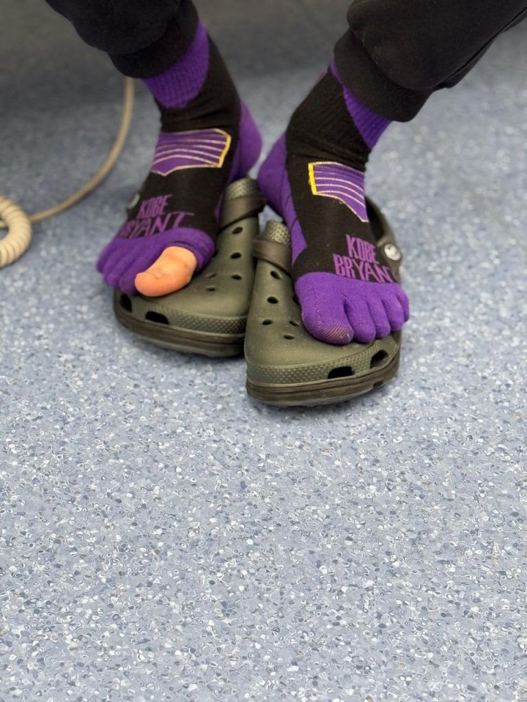 А згодом ветеран приловчився натискати на екран і великим пальцем ноги. Аби йому було зручніше це робити і ноги не мерзли, теща подарувала спеціально обрізані шкарпетки. “Одного разу вона привезла мені шкарпетки з окремими пальчиками. А на великому зробила отвір. Та ще й колір мій улюблений – фіолетовий! Це все мені дуже зайшло, бо, дійсно, стало зручніше і простіше”, –говорить Артем.